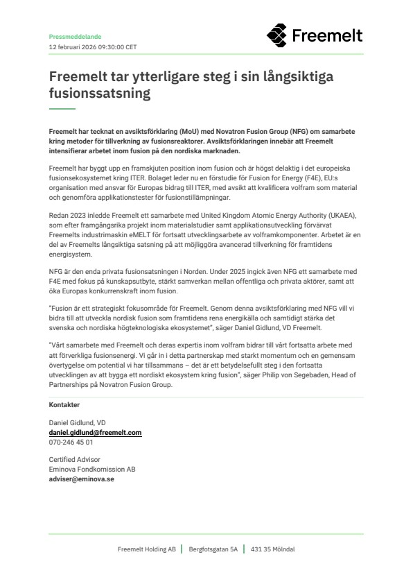 Freemelt har tecknat en avsiktsförklaring (MoU) med Novatron Fusion Group (NFG) om samarbete kring metoder för tillverkning av fusionsreaktorer. Avsiktsförklaringen innebär att Freemelt intensifierar arbetet inom fusion på den nordiska marknaden.