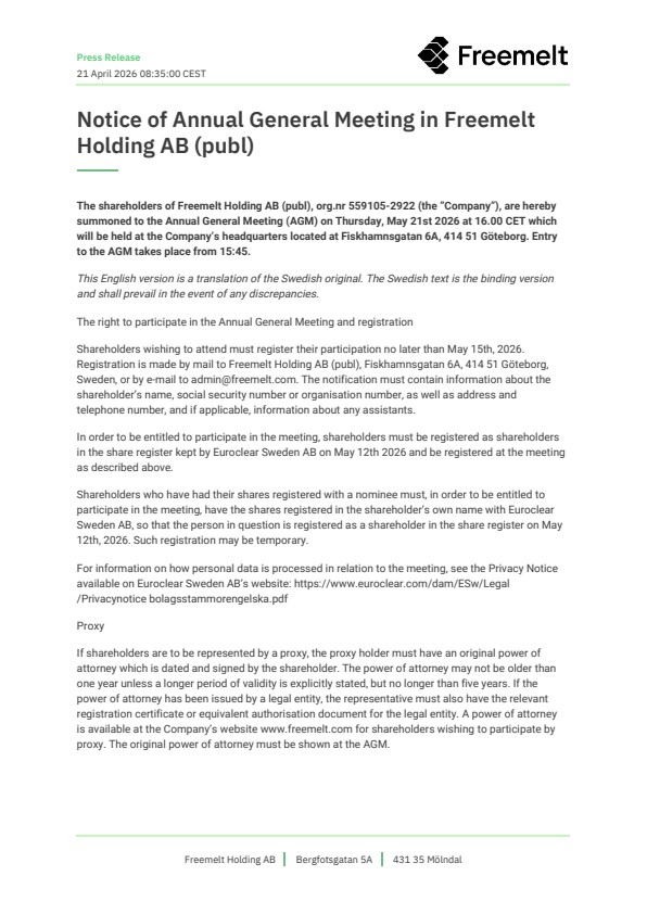 The shareholders of Freemelt Holding AB (publ), org.nr 559105-2922 (the ”Company”), are hereby summoned to the Annual General Meeting (AGM) on Thursday, May 21st 2026 at 16.00 CET which will be held at the Company’s headquarters located at Fiskhamnsgatan 6A, 414 51 Göteborg. Entry to the AGM takes place from 15:45.