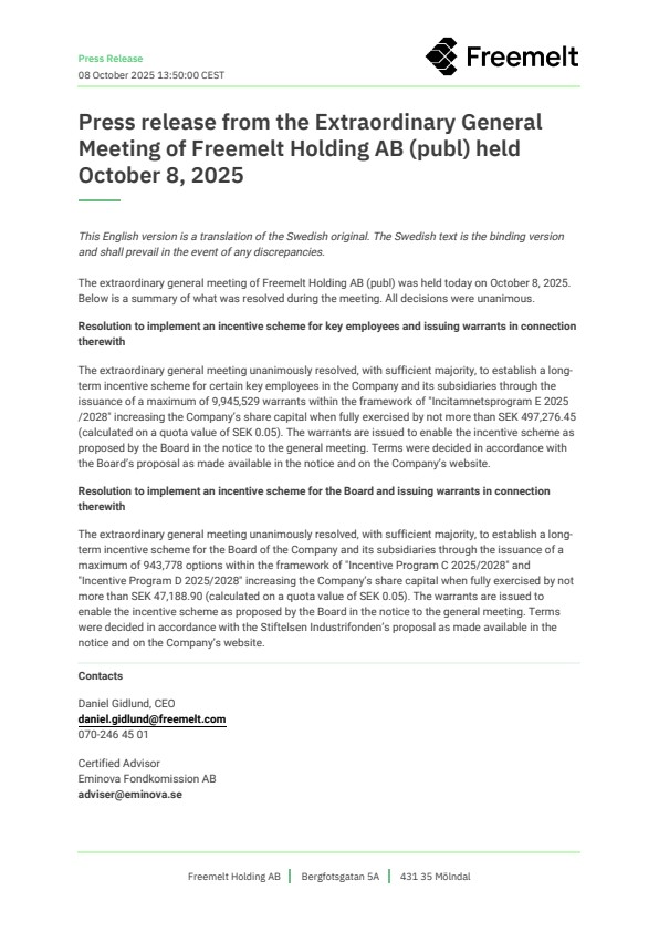 The extraordinary general meeting of Freemelt Holding AB (publ) was held today on October 8, 2025. Below is a summary of what was resolved during the meeting. All decisions were unanimous.